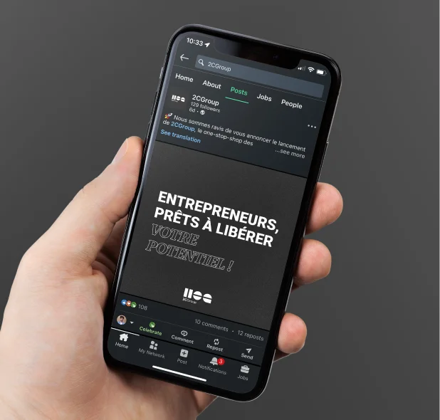 A platform for growth — From the main web portal to communication assets, we deployed the new identity across all touchpoints. The user experience was designed to be fluid, allowing entrepreneurs to easily navigate between services. To this day, we continue to support 2CGroup with communication tools that reflect their commitment to offering the best solutions possible.