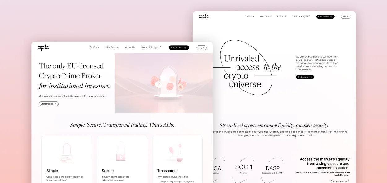 Le monde complexe du financement crypto peut-il paraître simple et sécurisé ? Aplo fournit des services de courtage premium, mais leur communication devait combler le fossé entre complexité technique et confiance institutionnelle. L'équipe a aidé Aplo à redéfinir son langage visuel, en exploitant de nouveaux supports créatifs pour s'adresser clairement à des clients avertis.