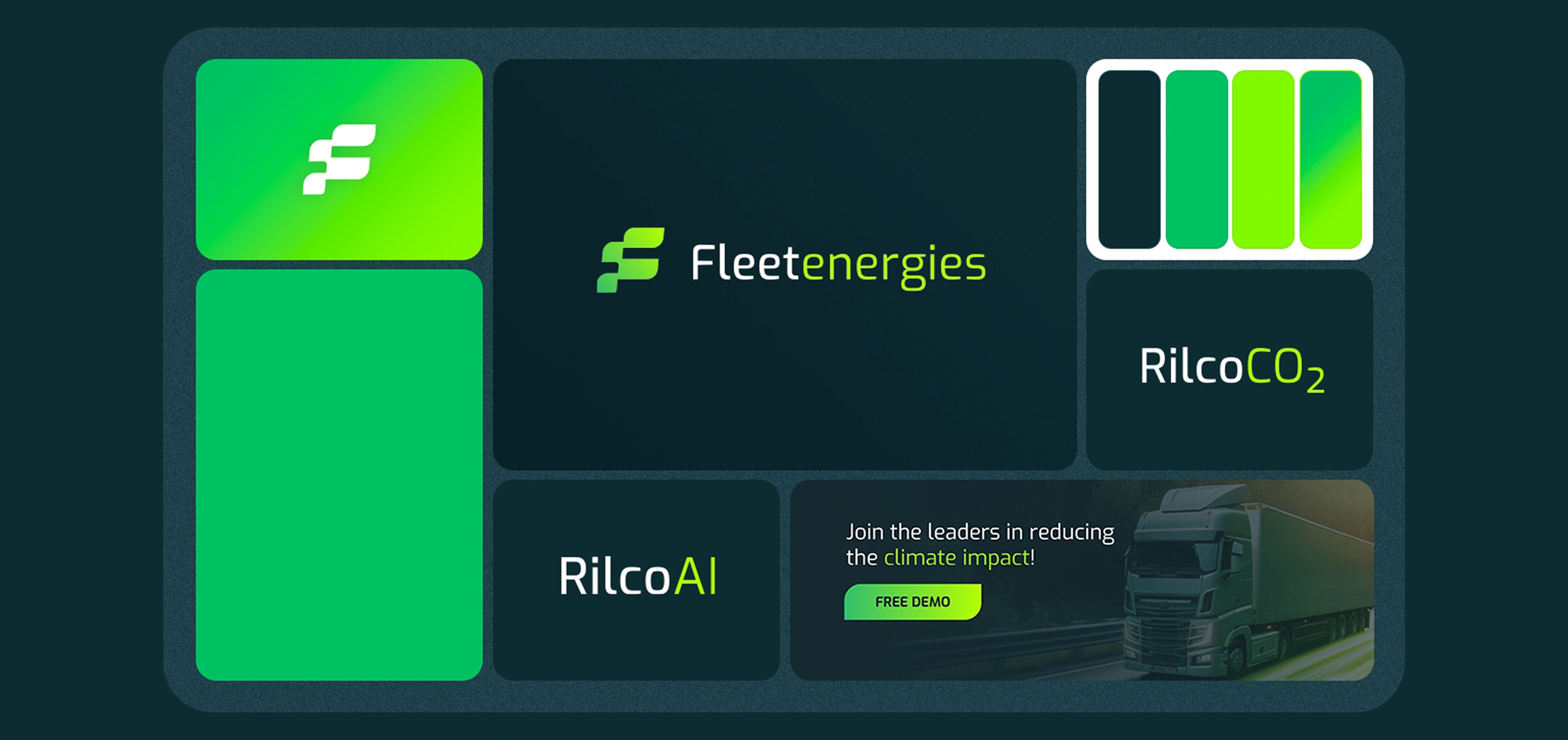 Rebranding Greentech — Nous avons accompagné Fleetenergies, innovateur utilisant l'IA pour réduire la consommation de carburant et les émissions de CO2, dans une refonte complète de marque et de design produit. Notre but était d'aligner leur identité visuelle avec leur haut niveau d'innovation, créant une marque cohérente qui reflète leur technologie de pointe.