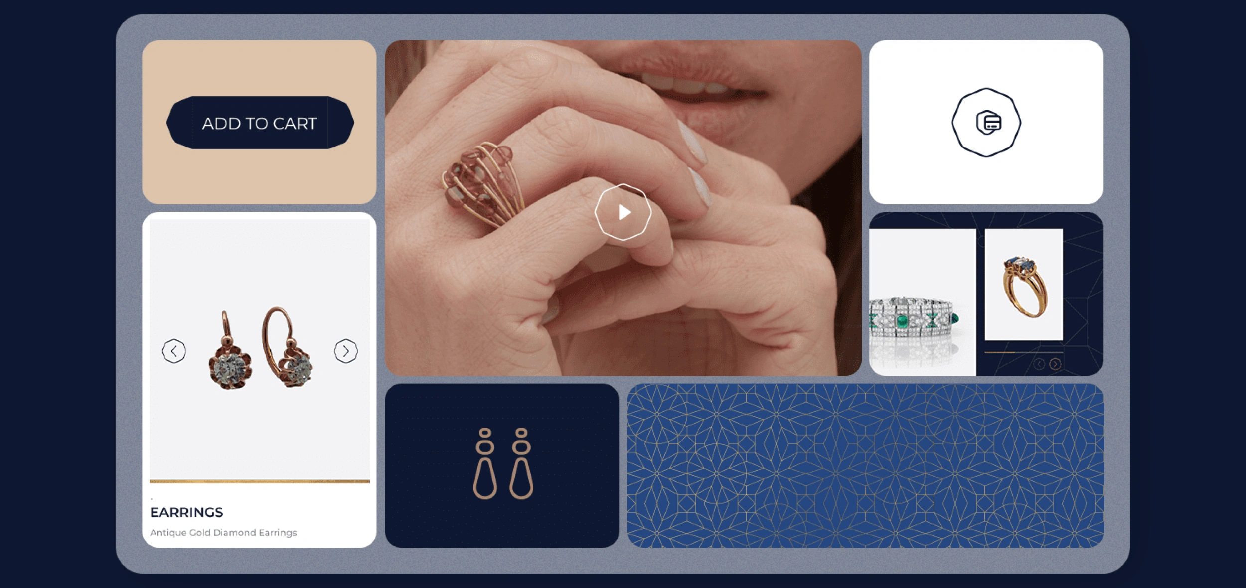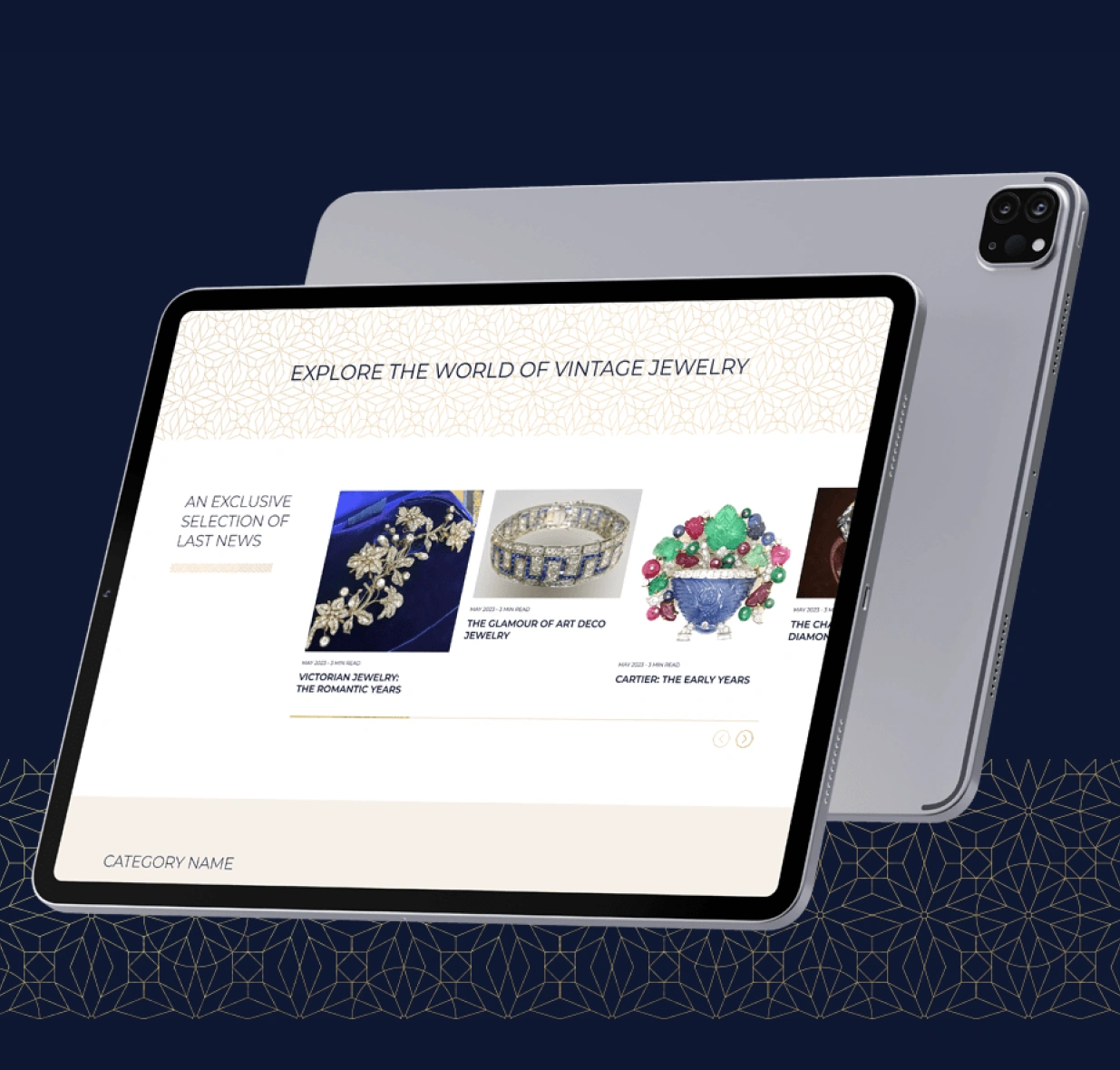 Luxe immersif — Vendre des pièces vintage de haute valeur en ligne nécessite de répliquer le niveau de détail du retail physique. Nous avons développé un écosystème digital holistique adapté au marché du luxe, utilisant une palette riche de bleus profonds et de textures dorées. Cette interface immersive met en valeur l'éclat des pierres précieuses tout en offrant un filtrage intuitif par époques spécifiques comme "Victorienne" ou "Art Déco".